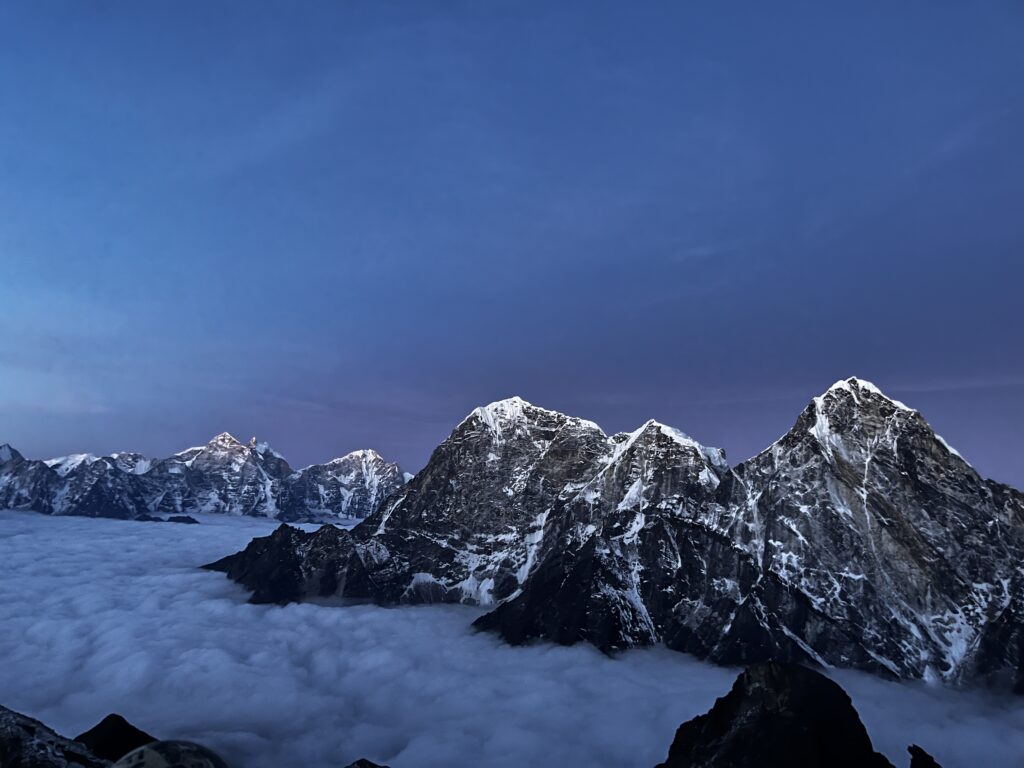 The journey to the high camp was comfortable and easy, which gave us low expectations for the summit attempt the next day. We had a great day at high camp with the beautiful mountains all around. A pleasant one-hour photographic session to pass the time with some small talk. We had to leave by 1am and be there for breakfast at 12.30am, so we wrapped up about 7pm. Despite my prior experience with a few night treks, this one was unlike any of the others. It hurt to wake up around 12:30 a.m. because it was freezing outside the tent. It was a little uncomfortable at first because it was about -16C, but as we got acclimated to it, it was pretty manageable. I was at first both anxious and thrilled, that I was unable to eat much. The first two hours were spent just trekking and weren’t technical. Although the hike was rather strenuous and labor-intensive. The dark silhouettes of the Ama Dablam, Tobuche, Cholatsen, Kangtega, and other mountains would change with each break. I had a strange feeling of serenity and tranquility while climbing in the dark with just headlamps for light, which was really pleasant and lifted my spirits. Even if you could only see the mountains’ outline at night, they nevertheless had a magnificent, sparkling appearance. We avoided fatigue by taking regular breaks and moving at our own pace — neither too fast nor too slow.